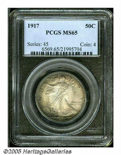 <B>1917<50C> MS65 PCGS.</B></I> Lustrous silver-gray surfaces exhibit a band of charcoal-gray patina around the margins. Liberty's head, left thumb, and the adjacent branches are all well defined, while the gown lines are weak. A few minor marks on Liberty's right leg are mentioned for accuracy. PCGS has certified 76 pieces finer (6/05).