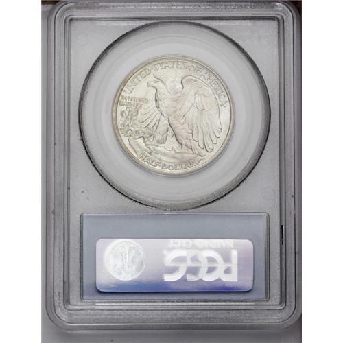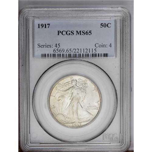<B>1917 50C MS65 PCGS.</B></I> Silver-gray surfaces reveal satiny luster and hints of sky-blue undertones. The design elements are generally well impressed, with Liberty's left thumb and the adjacent branches showing nice definition. The skirt lines, on the other hand, are somewhat soft. A few minor marks on the lower skirt do not distract.