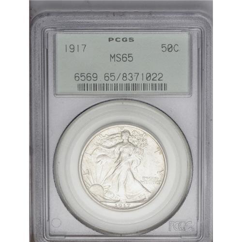 <B>1917<50C> MS65 PCGS.</B></I> The luster is typical for the issue and the devices remain remarkably intact for the grade. The coloration is also attractive with an even, fully transparent layer of golden patina over both sides. Housed in an older green-label PCGS holder.