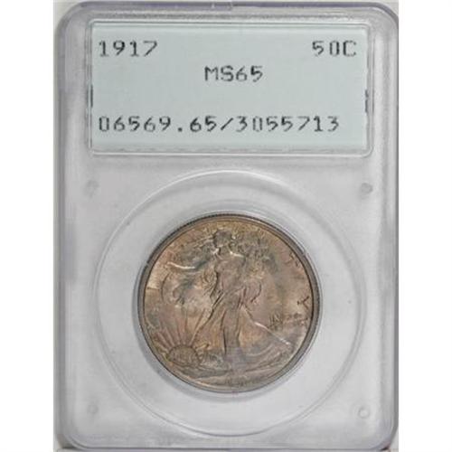 <B>1917 50C MS65 PCGS.</B></I> Deep rose-red, orange, and green-gray embraces this lustrous and sharply struck early Walking Liberty half. Housed in a first generation holder.<BR><I>Ex: Long Beach Bullet (Heritage, 2/99), lot 288.</B></I><BR><BR><B>Coin Engraver:</B> Adolph A. Weinman<BR><BR><b>Shipping:</b> Coins & Currency (<a target="_blank" href="http://www.heritageauctions.com/common/shipping.php">view shipping information</a>)