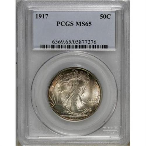 <B>1917 50C MS65 PCGS.</B></I> A well-defined Gem with powerful, slightly satiny luster. The lower obverse and central reverse are minimally toned, while the rest of the piece has subtle, pleasing violet and gold-orange patina.<BR><BR><B>Coin Engraver:</B> Adolph A. Weinman<BR><BR><b>Shipping:</b> Coins & Currency (<a target="_blank" href="http://www.heritageauctions.com/common/shipping.php">view shipping information</a>)