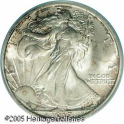 <B>1917 50C MS66 PCGS.</B></I> Vibrant, untoned centers are framed in mottled russet toning with an occasional flash of deep green on the reverse periphery. The most obtainable of the early Walking Liberty issues in Mint State, but legitimately scarce this nice. Population: 75 in 66, 2 finer (1/05). Lot:7927