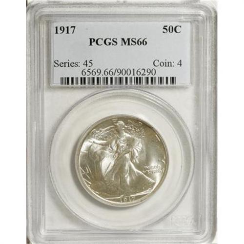 <B>1917 50C MS66 PCGS.</B></I> While the mintmarked Walker issues of 1917 come in two varieties, the Philadelphia pieces have no such distinction. This attentively struck and shining Premium Gem offers delicate patina in shades of silver-gray. PCGS has certified only two finer pieces (8/07).<BR><BR><B>Coin Engraver:</B> Adolph A. Weinman<BR><BR><b>Shipping:</b> Coins & Currency (<a target="_blank" href="http://www.heritageauctions.com/common/shipping.php">view shipping information</a>)