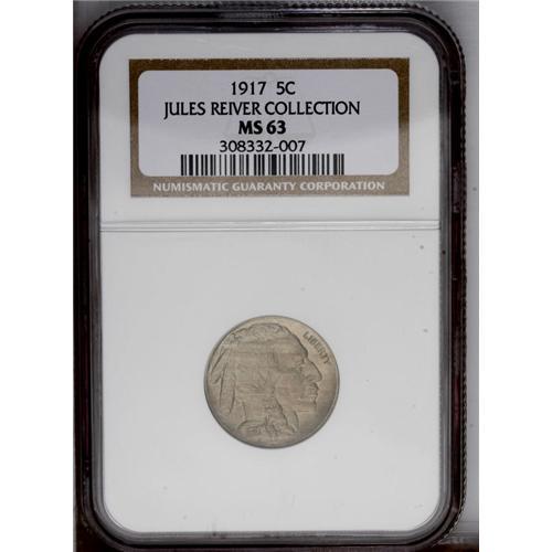 <B>1917<5C> MS63 NGC.</B></I> Soft luster emanates from somewhat streaked golden-gray surfaces that exhibit sharply struck design elements. Both sides are devoid of significant contact marks, but reveal a few tiny flecks, especially in the lower left (facing) obverse quadrant.