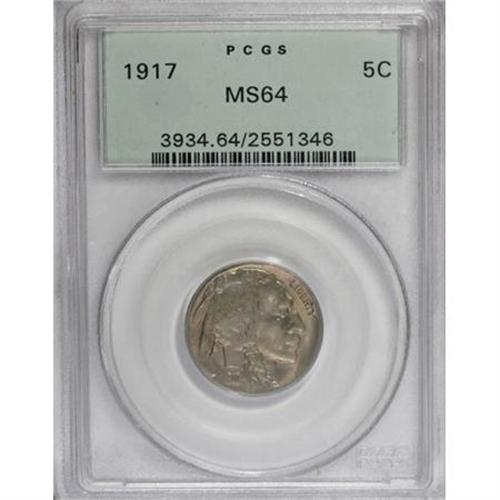 <B>1917 5C MS64 PCGS.</B></I> PCGS Population (448/390). NGC Census: (308/156). Mintage: 51,424,020. Numismedia Wsl. Price for NGC/PCGS coin in MS64: $172. (#3934)<BR><BR><B>Coin Engraver:</B> James E. Fraser<BR><BR><b>Shipping:</b> Coins & Currency (<a target="_blank" href="http://www.heritageauctions.com/common/shipping.php">view shipping information</a>)