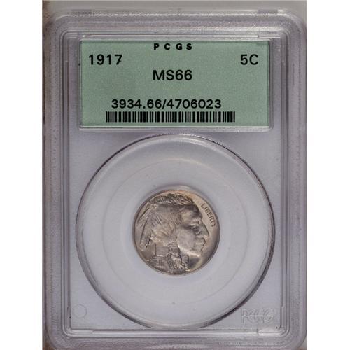 <B>1917<5C> MS66 PCGS.</B></I> A satiny rose-gold and battleship-gray Premium Gem with uncommonly clean surfaces and a suitable strike. Encapsulated in a green label holder. PCGS has certified a mere 12 pieces finer, as of (4/06).