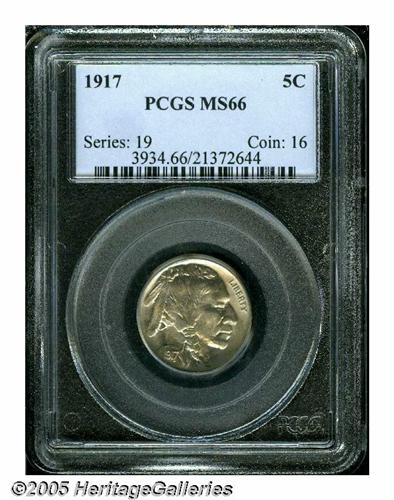 <B>1917<5C> MS66 PCGS.</B></I> Blushes of apricot and steel-blue color endow this nicely struck and lustrous Gem. A bold die crack (as made) connects the bases of the letters in CENTS. Population: 102 in 66, 12 finer (6/05).