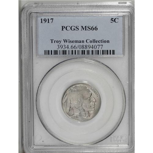 <B>1917<5C> MS66 PCGS.</B></I> Boldly impressed with lovely blue-gray and peach patina that covers both sides. Quite lustrous with a few tiny carbon flecks behind the feather.<BR><I>From The Troy Wiseman Collection.</B></I>