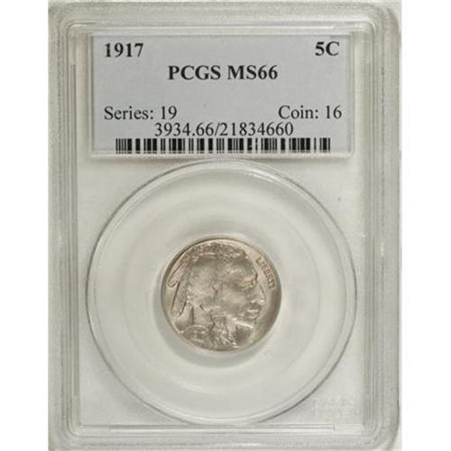 <B>1917 5C MS66 PCGS.</B></I> Sharply struck and untoned, with lustrous, amazingly clean surfaces that have a pleasing satiny glow. A beautiful premium Gem. Population: 123 in 66, 12 finer (6/07).<BR><BR><b>Shipping:</b> Coins & Currency (<a target="_blank" href="http://www.heritageauctions.com/common/shipping.php">view shipping information</a>)