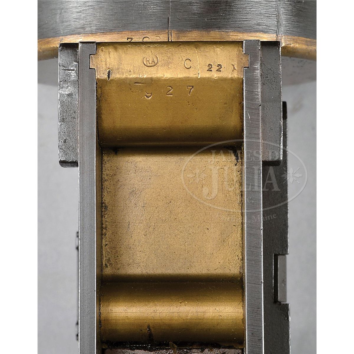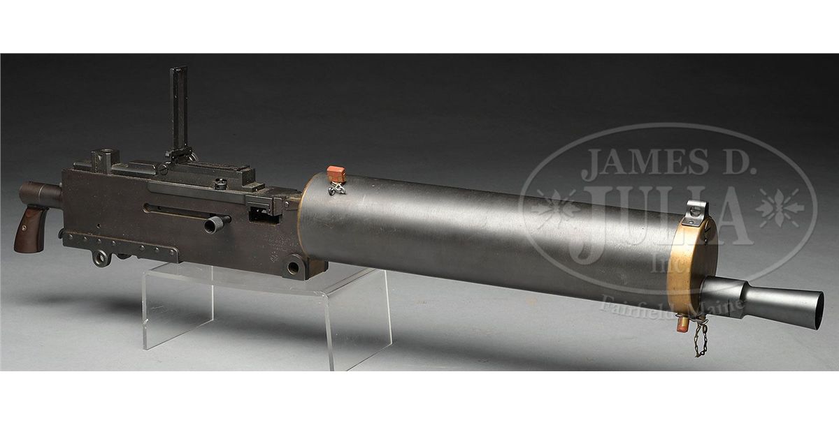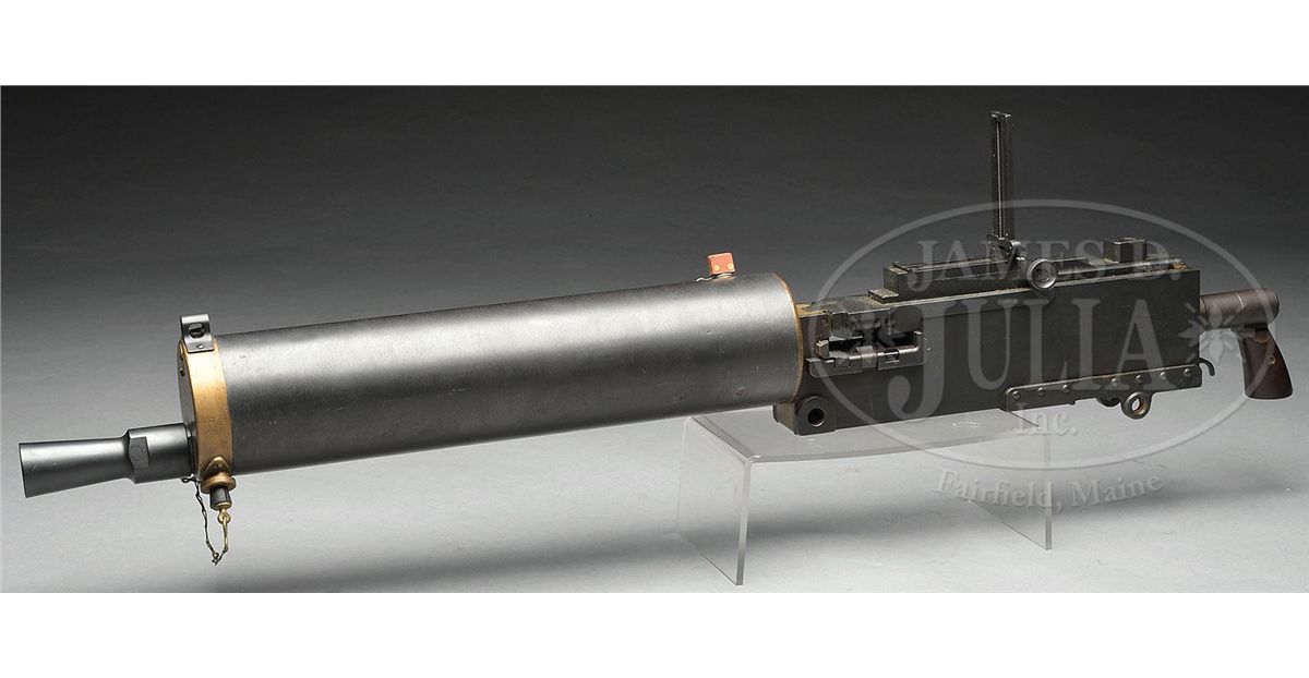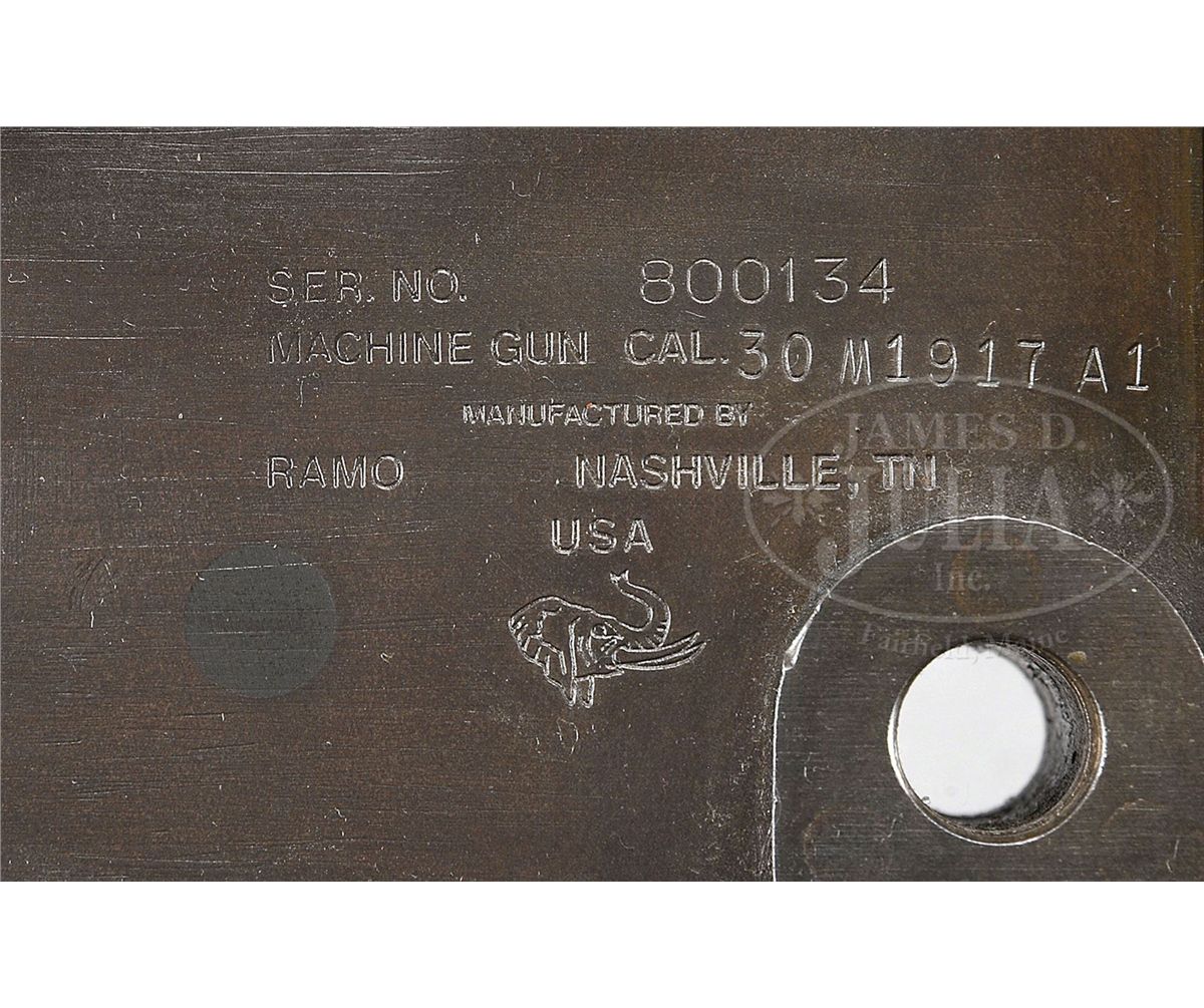 SN 800134. Cal .308 24" bbl. This is a 1928 commercial water cooled machine gun kit assembled on a Ramo registered sideplate and includes bakelite hand grip panels, brass trunnion and endcap. 1928 commercial flash hider and red hard rubber thumb pieces on water filler and drain caps. Steam exit cork is hard rubber attached by non vintage brass chain. Bolt is marked "7.62". Front .308 spacer is present. Tension spring is present within top cover to keep arm to left when cover is raised. Brass trunnion is marked "844" at top. Front endcap is also marked "44". This weapon passes functions check and appears fully functional. A number of these kits were brought into the country years ago and assembled onto registered sideplates. This is undoubtedly one of them. CONDITION: Overall finish and appearance is excellent as refinished. Close observation reveals tiny pin pricks of pitting all along left sideplate. Bore is excellent as is bolt and all internals. Almost certainly unfired since being assembled and refinished. Trunnion has a vertical line on the right side parallel to the right sideplate line where there is a provision to remove the top cover retaining pin by rotating a lever. This in no way detracts from the attractiveness of this piece. This would make a great display piece for any WWI era collection, or a shooter. 4-47333 JWK28