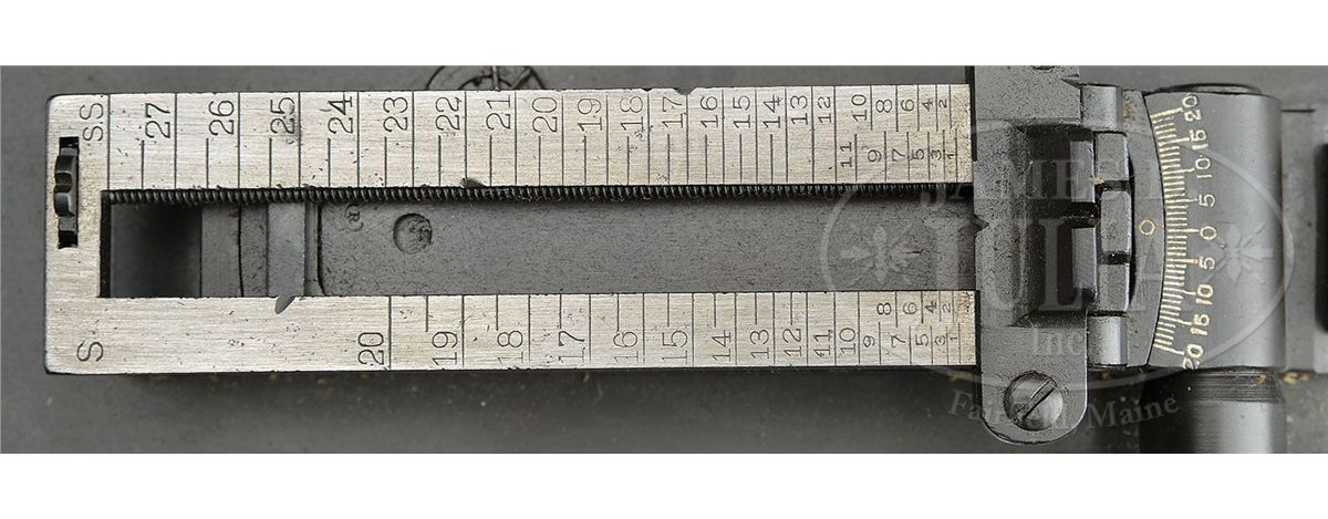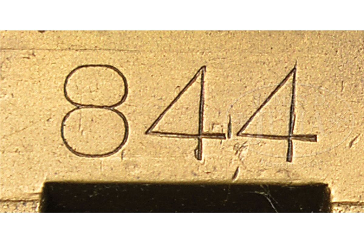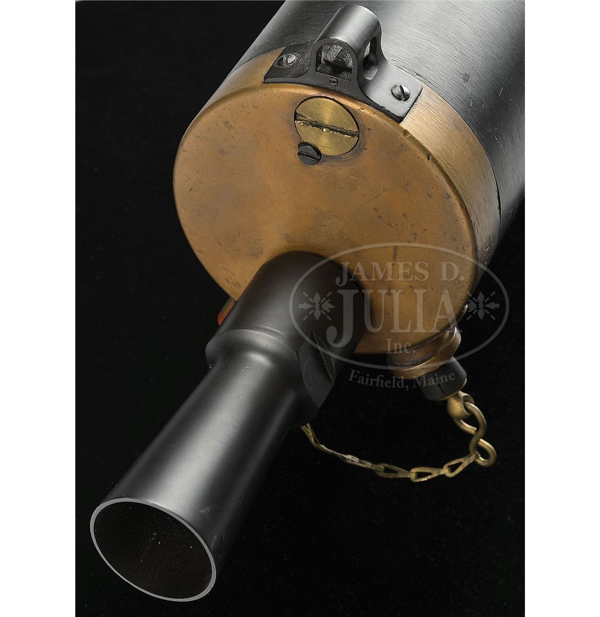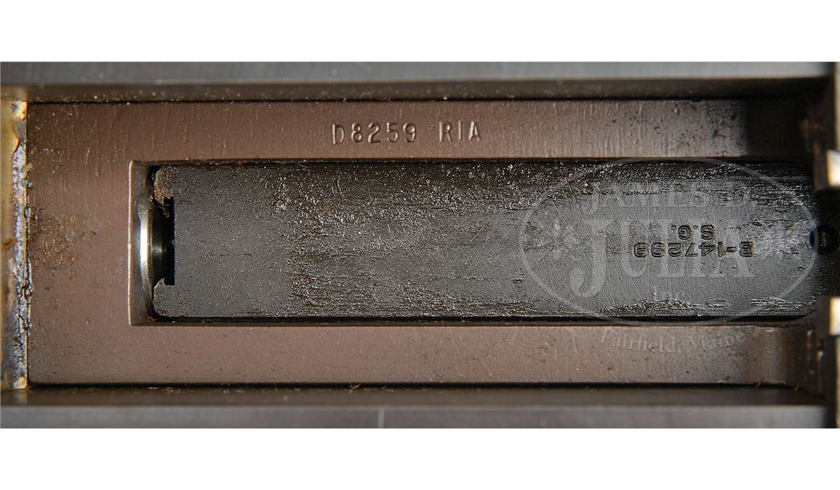SN 800134. Cal .308 24" bbl. This is a 1928 commercial water cooled machine gun kit assembled on a Ramo registered sideplate and includes bakelite hand grip panels, brass trunnion and endcap. 1928 commercial flash hider and red hard rubber thumb pieces on water filler and drain caps. Steam exit cork is hard rubber attached by non vintage brass chain. Bolt is marked "7.62". Front .308 spacer is present. Tension spring is present within top cover to keep arm to left when cover is raised. Brass trunnion is marked "844" at top. Front endcap is also marked "44". This weapon passes functions check and appears fully functional. A number of these kits were brought into the country years ago and assembled onto registered sideplates. This is undoubtedly one of them. CONDITION: Overall finish and appearance is excellent as refinished. Close observation reveals tiny pin pricks of pitting all along left sideplate. Bore is excellent as is bolt and all internals. Almost certainly unfired since being assembled and refinished. Trunnion has a vertical line on the right side parallel to the right sideplate line where there is a provision to remove the top cover retaining pin by rotating a lever. This in no way detracts from the attractiveness of this piece. This would make a great display piece for any WWI era collection, or a shooter. 4-47333 JWK28