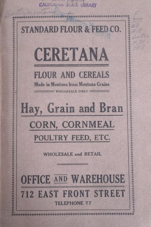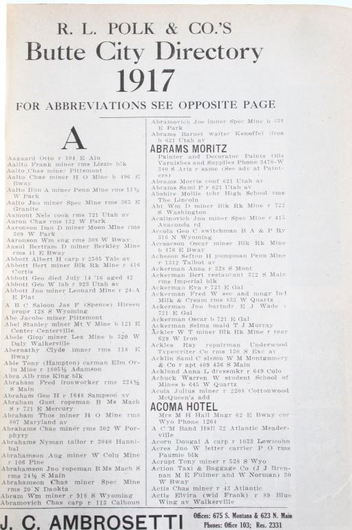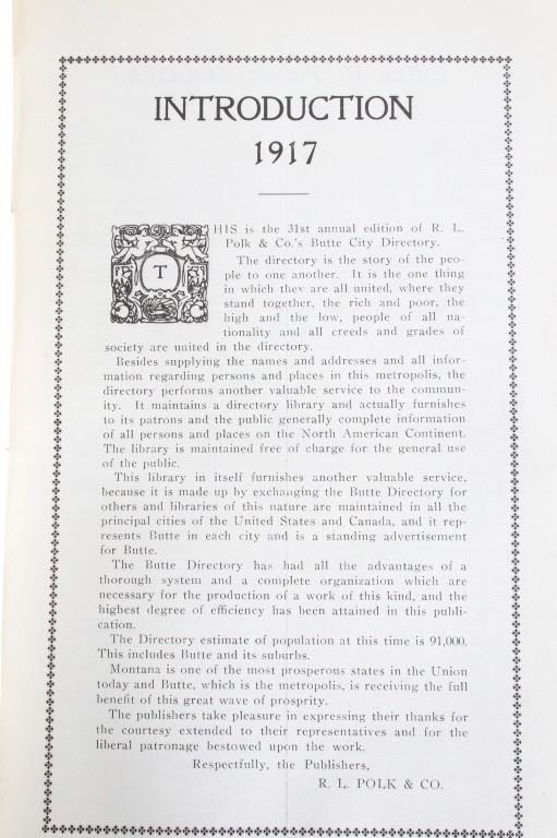 Featured in this lot is this Butte City, Montana Directory, circa 1917. This directory is a great reference and a wealth of information from a time when mining was still strong and Butte was prosperous. The directories are filled with advertisements for businesses, such as undertakers, coal, lumber, realtors, automobiles, secret societies, etc. The condition of this directory is fair, with wear consistent with use and age. The measurements of this directory are 9 1/2" x 7".