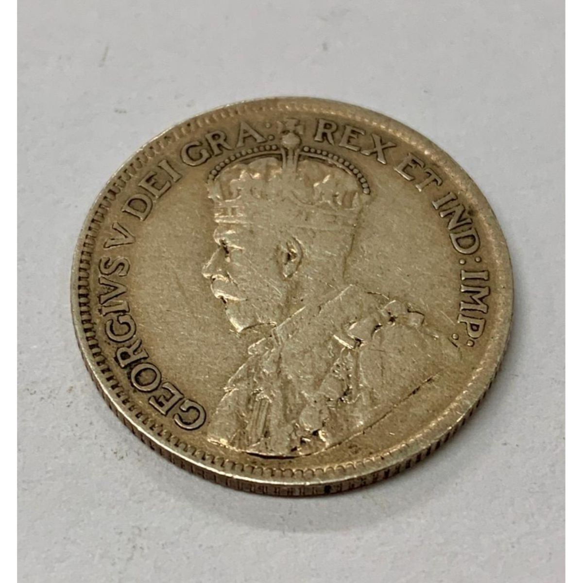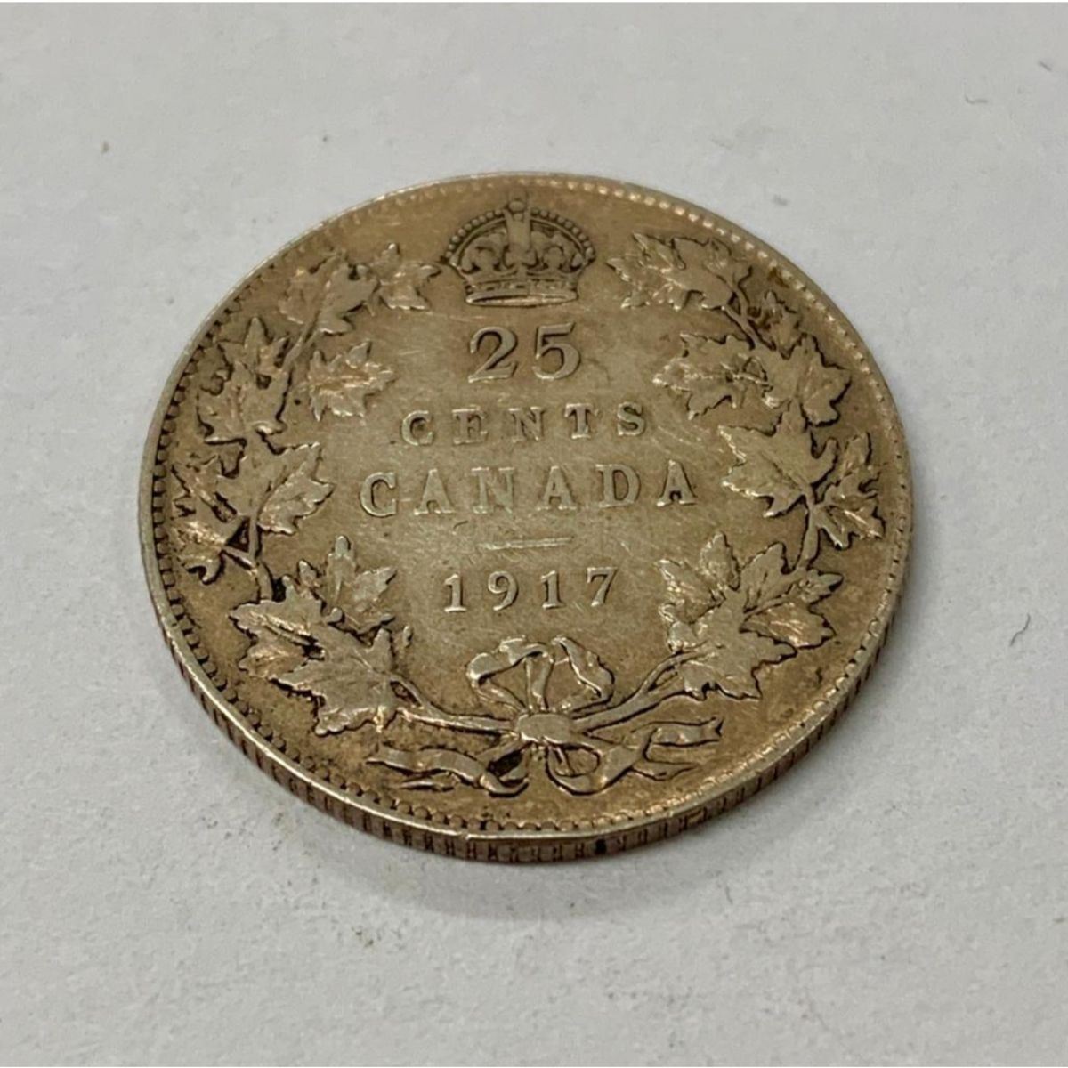 Obverse The portrait in left profile of George V is surrounded with the inscription "GEORGIVS V DEI GRA: REX ET IND:IMP" (George V, King and Emperor of India by the grace of God) Lettering:Â GEORGIVS V DEI GRA: REX ET IND:IMP: Reverse The facial value, accompanied with the inscription "CANADA", is surrounded with two maple boughs and a crown Lettering:Â 25 CENTS CANADA 1914 Alloy: 92.5% silver, 7.5% copper