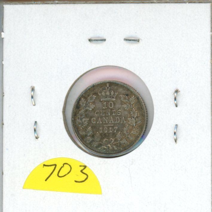 1917 Canadian Silver 10 Cents. World War I issue. VF-30. Nice.
