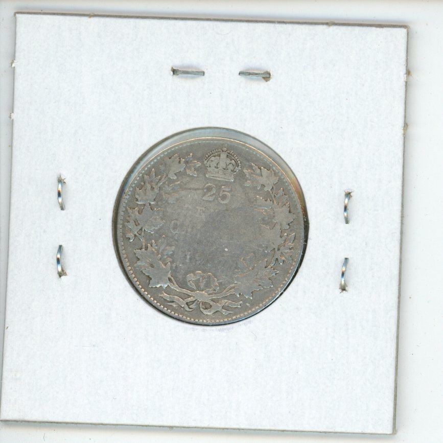 1917 Canadian Silver 25 Cents. Minted during World War I. VG-10.
