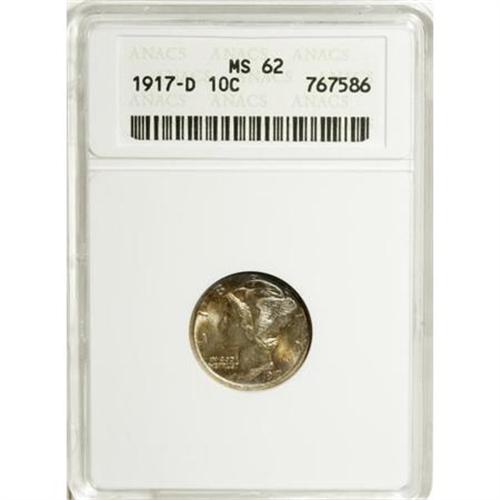 <B>1917-D 10C MS62 ANACS.</B></I> NGC Census: (37/165). PCGS Population (28/124). Mintage: 9,402,000. Numismedia Wsl. Price for NGC/PCGS coin in MS62: $183. (#4912)<BR><BR><B>Coin Engraver:</B> Adolph A. Weinman<BR><BR><b>Shipping:</b> Coins & Currency (<a target="_blank" href="http://www.heritageauctions.com/common/shipping.php">view shipping information</a>)