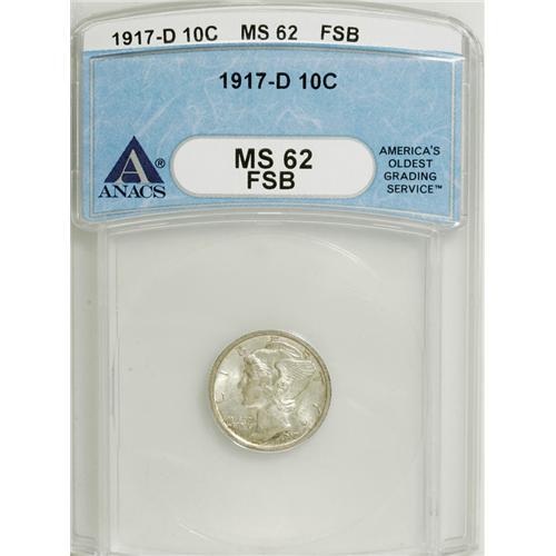 <B>1917-D 10C MS62 Full Bands ANACS.</B></I> NGC Census: (31/124). PCGS Population (25/192). Mintage: 9,402,000. Numismedia Wsl. Price: $267. (#4913)<BR><BR><b>Shipping:</b> Coins & Currency (<a target="_blank" href="http://www.heritageauctions.com/common/shipping.php">view shipping information</a>)