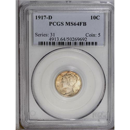 <B>1917-D<10C> MS64 Full Bands PCGS.</B></I> Well struck and carefully preserved, with bright satin luster and dappled russet-gold toning near the borders of each side. The dies were rotated clockwise by around thirty degrees. Seemingly blemish-free, and a conservatively graded near-Gem example of this second year issue. Population: 81 in 64 Full Bands, 37 finer (2/06).