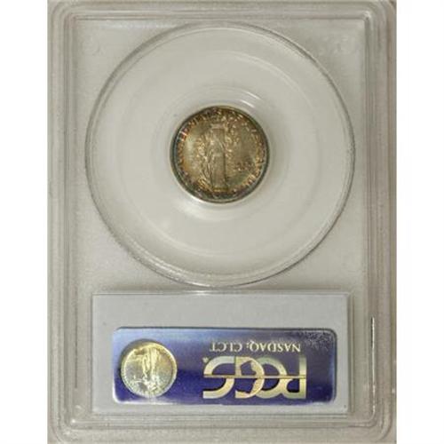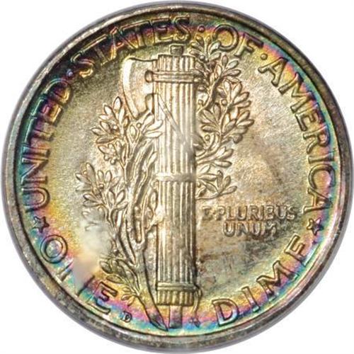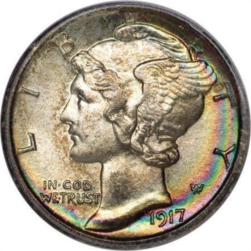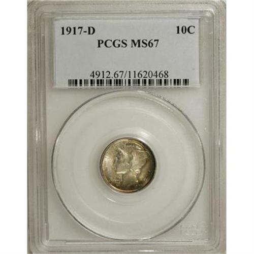 <B>1917-D 10C MS67 PCGS.</B></I> Although very well struck on the design elements, as are most 1917-D dimes, the definition on the horizontal crossbands is just shy of complete. Thin crescents of emerald-green, rose, and orange iridescence dominate each side, a feature that makes this Superb representative one of the most eye catching examples of the issue seen by this cataloger. <BR><BR><B>Coin Engraver:</B> Adolph A. Weinman<BR><BR><b>Shipping:</b> Coins & Currency (<a target="_blank" href="http://www.heritageauctions.com/common/shipping.php">view shipping information</a>\)