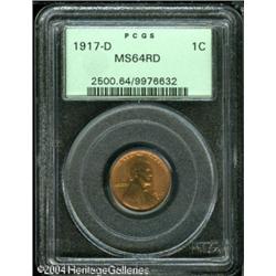 1917-D 1C MS64 Red PCGS. Boldly struck from slight <B>1917-D 1C MS64 Red PCGS.</B></I> Boldly struck from slightly worn dies, with matte-like surfaces, bright luster, no appreciable surface marks, and a small spot between the feet of F and A in OF AMERICA.<BR><I>From The Dennis Dewart Collection.</B></I> <BR><BR><B>Important notice:</B> Heritage usually auctions material at the rate of 200-250 lots per hour. On some occasions eBay Live bid software or the Internet may not be able to keep up with the pace of the auction. We recommend placing a realistic absentee bid now as insurance to avoid disappointment. Occasionally the auctioneer may eliminate or reject an eBay Live bid, and the auctioneer may also reopen a lot after the close of the eBay live bidding (usually because we missed an audience bid), and may reject your bid even if it shows you as the winning bidder. By bidding via eBay Live, you agree that Heritage may award the lot to another bidder at its sole discretion under the circumstances described above or any other reasonable circumstances. Since eBay bids are not shown to us until we open the lot on the floor, we treat those bids just like floor bids. In most cases the floor responds before the eBay bid is presented to us, due to Internet lag time, so for consistency we have made it a policy that floor bids are always considered first over tie eBay live bids. Also please note that all Heritage lots purchased through eBay Live carry a 20% Buyer's Premium. Please make sure you read the Terms and Conditions before you bid. This lot is being auctioned in conjunction with a live floor auction by Heritage Galleries & Auctioneers. All final auction and invoice information will be supplied by Heritage Galleries & Auctioneers, and all other information should be considered preliminary. Lot:5147