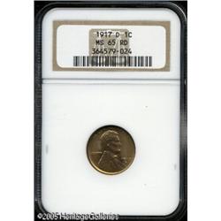 <B>1917-D 1C MS65 Red NGC.</B></I> A surprisingly difficult early Denver mint issue that is quite challenging in Gem condition and with full red color. This is a lovely, golden-red example that is typically struck throughout. The only mentionable flaws are a few specks of carbon on the reverse. Lot:5444