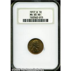 <B>1917-D 1C MS65 Red NGC.</B></I> Attractive orange-gold surfaces reveal lime-green accents on Lincoln's portrait, and a couple of streaks of faded crimson over each side. The design elements are sharply defined. NGC and PCGS combined have certified only five pieces finer (2/05).