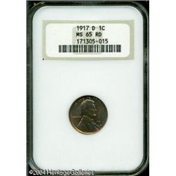 1917-D 1C MS65 Red NGC. Brassy-copper patina revea <B>1917-D 1C MS65 Red NGC.</B></I> Brassy-copper patina reveals splashes of orange and crimson on the obverse. The design elements are adequately struck, and the lustrous surfaces are virtually free of contact marks. Population: 19 in 65, 0 finer (11/04). <BR><BR><B>Important notice:</B> Heritage usually auctions material at the rate of 200-250 lots per hour. On some occasions eBay Live bid software or the Internet may not be able to keep up with the pace of the auction. We recommend placing a realistic absentee bid now as insurance to avoid disappointment. Occasionally the auctioneer may eliminate or reject an eBay Live bid, and the auctioneer may also reopen a lot after the close of the eBay live bidding (usually because we missed an audience bid), and may reject your bid even if it shows you as the winning bidder. By bidding via eBay Live, you agree that Heritage may award the lot to another bidder at its sole discretion under the circumstances described above or any other reasonable circumstances. Since eBay bids are not shown to us until we open the lot on the floor, we treat those bids just like floor bids. In most cases the floor responds before the eBay bid is presented to us, due to Internet lag time, so for consistency we have made it a policy that floor bids are always considered first over tie eBay live bids. Also please note that all Heritage lots purchased through eBay Live carry a 20% Buyer's Premium. Please make sure you read the Terms and Conditions before you bid. This lot is being auctioned in conjunction with a live floor auction by Heritage Galleries & Auctioneers. All final auction and invoice information will be supplied by Heritage Galleries & Auctioneers, and all other information should be considered preliminary. Lot:5270