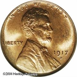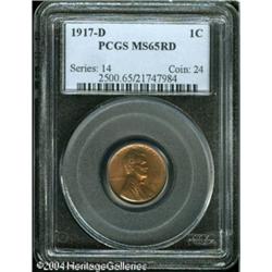 1917-D 1C MS65 Red PCGS. Despite an original minta <B>1917-D 1C MS65 Red PCGS.</B></I> Despite an original mintage in excess of 55 million, the 1917-D Cent is a conditionally scarce item as a Gem, with just 58 pieces graded at MS65, by NGC and PCGS combined, with just 5 finer. This example is sharply struck with just a few superficial blemishes and appealing tan-orange color. The satiny surfaces are essentially carbon-free. Population: 39 in 65, 5 finer (11/04). <BR><BR><B>Important notice:</B> Heritage usually auctions material at the rate of 200-250 lots per hour. On some occasions eBay Live bid software or the Internet may not be able to keep up with the pace of the auction. We recommend placing a realistic absentee bid now as insurance to avoid disappointment. Occasionally the auctioneer may eliminate or reject an eBay Live bid, and the auctioneer may also reopen a lot after the close of the eBay live bidding (usually because we missed an audience bid), and may reject your bid even if it shows you as the winning bidder. By bidding via eBay Live, you agree that Heritage may award the lot to another bidder at its sole discretion under the circumstances described above or any other reasonable circumstances. Since eBay bids are not shown to us until we open the lot on the floor, we treat those bids just like floor bids. In most cases the floor responds before the eBay bid is presented to us, due to Internet lag time, so for consistency we have made it a policy that floor bids are always considered first over tie eBay live bids. Also please note that all Heritage lots purchased through eBay Live carry a 20% Buyer's Premium. Please make sure you read the Terms and Conditions before you bid. This lot is being auctioned in conjunction with a live floor auction by Heritage Galleries & Auctioneers. All final auction and invoice information will be supplied by Heritage Galleries & Auctioneers, and all other information should be considered preliminary. Lot:5271