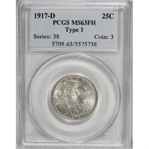 <B>1917-D 25C Type One MS63 Full Head PCGS.</B></I> PCGS Population (219/691). NGC Census: (141/522). Mintage: 1,509,200. Numismedia Wsl. Price for NGC/PCGS coin in MS63: $420. (#5709)<BR><BR><B>Coin Engraver:</B> Hermon A. MacNeil<BR><BR><b>Shipping:</b> Coins & Currency (<a target="_blank" href="http://www.heritageauctions.com/common/shipping.php">view shipping information</a>)