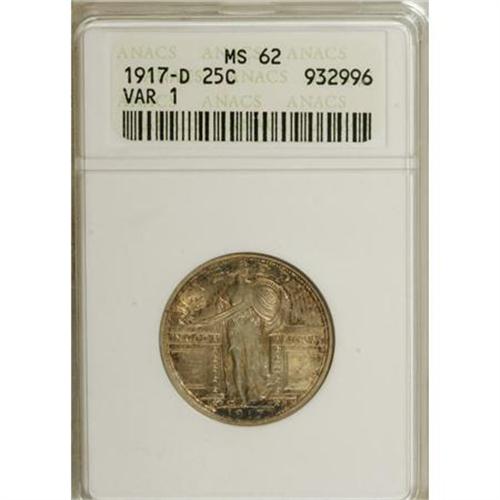 <B>1917-D 25C Type One MS62 ANACS.</B></I> NGC Census: (36/260). PCGS Population (59/368). Mintage: 1,509,200. Numismedia Wsl. Price for NGC/PCGS coin in MS62: $267. (#5708)<BR><BR><B>Coin Engraver:</B> Hermon A. MacNeil<BR><BR><b>Shipping:</b> Coins & Currency (<a target="_blank" href="http://www.heritageauctions.com/common/shipping.php">view shipping information</a>)