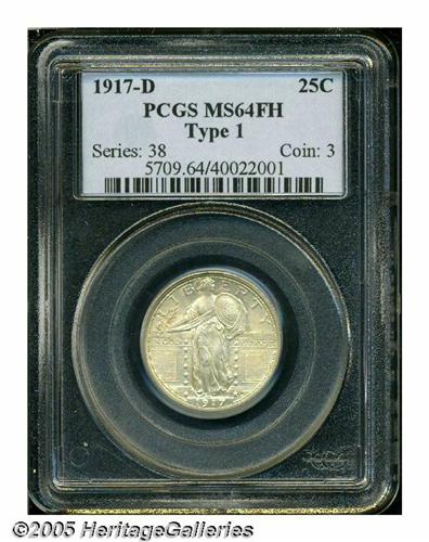 <B>1917-D<25C> Type One MS64 Full Head PCGS.</B></I> Boldly struck throughout, with lovely light olive-gray toning, augmented by small amounts of dappled milky color on each side, typical satin luster, and just two or three insignificant contact marks overall.
