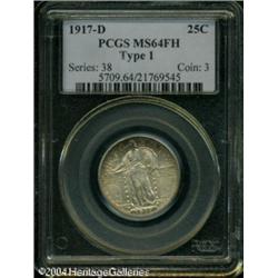 1917-D 25C Type One MS64 Full Head PCGS. Fully str <B>1917-D 25C Type One MS64 Full Head PCGS.</B></I> Fully struck with satin luster, lovely silver-gray toning, with russet accents near the peripheries, and the seemingly complete absence of distracting surface marks on both the obverse and the reverse. <BR><BR><B>Important notice:</B> Heritage usually auctions material at the rate of 200-250 lots per hour. On some occasions eBay Live bid software or the Internet may not be able to keep up with the pace of the auction. We recommend placing a realistic absentee bid now as insurance to avoid disappointment. Occasionally the auctioneer may eliminate or reject an eBay Live bid, and the auctioneer may also reopen a lot after the close of the eBay live bidding (usually because we missed an audience bid), and may reject your bid even if it shows you as the winning bidder. By bidding via eBay Live, you agree that Heritage may award the lot to another bidder at its sole discretion under the circumstances described above or any other reasonable circumstances. Since eBay bids are not shown to us until we open the lot on the floor, we treat those bids just like floor bids. In most cases the floor responds before the eBay bid is presented to us, due to Internet lag time, so for consistency we have made it a policy that floor bids are always considered first over tie eBay live bids. Also please note that all Heritage lots purchased through eBay Live carry a 20% Buyer's Premium. Please make sure you read the Terms and Conditions before you bid. This lot is being auctioned in conjunction with a live floor auction by Heritage Galleries & Auctioneers. All final auction and invoice information will be supplied by Heritage Galleries & Auctioneers, and all other information should be considered preliminary. Lot:5931