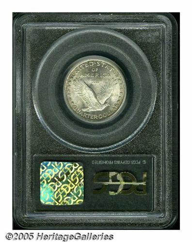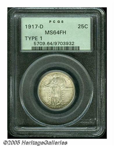 <B>1917-D<25C> Type One MS64 Full Head PCGS.</B></I> This lustrous silver-gray and honey tinged near-Gem is meticulously struck and has the look of a finer grade. A pinscratch on the left (facing) wing is all that limits the grade. Certified in a green label holder.<BR><I>From The Stig Ericsson Collection.</B></I>