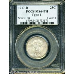 1917-D 25C Type One MS64 Full Head PCGS. Well stru <B>1917-D 25C Type One MS64 Full Head PCGS.</B></I> Well struck with satiny luster and muted pink-gray color on the obverse, and a frosty untoned reverse with beautiful, matte-like surface textures. There are only a few tiny contact marks on each side of this attractive near-Gem. <BR><BR><B>Important notice:</B> Heritage usually auctions material at the rate of 200-250 lots per hour. On some occasions eBay Live bid software or the Internet may not be able to keep up with the pace of the auction. We recommend placing a realistic absentee bid now as insurance to avoid disappointment. Occasionally the auctioneer may eliminate or reject an eBay Live bid, and the auctioneer may also reopen a lot after the close of the eBay live bidding (usually because we missed an audience bid), and may reject your bid even if it shows you as the winning bidder. By bidding via eBay Live, you agree that Heritage may award the lot to another bidder at its sole discretion under the circumstances described above or any other reasonable circumstances. Since eBay bids are not shown to us until we open the lot on the floor, we treat those bids just like floor bids. In most cases the floor responds before the eBay bid is presented to us, due to Internet lag time, so for consistency we have made it a policy that floor bids are always considered first over tie eBay live bids. Also please note that all Heritage lots purchased through eBay Live carry a 20% Buyer's Premium. Please make sure you read the Terms and Conditions before you bid. This lot is being auctioned in conjunction with a live floor auction by Heritage Galleries & Auctioneers. All final auction and invoice information will be supplied by Heritage Galleries & Auctioneers, and all other information should be considered preliminary. Lot:5933