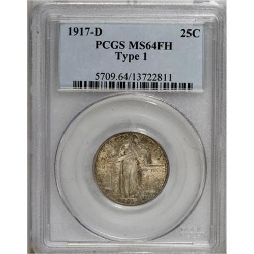 <B>1917-D 25C Type One MS64 Full Head PCGS.</B></I> This lustrous near-Gem features original, medium copper-gold, lime, and stone-gray toning. Well preserved and highly attractive.<BR><BR><B>Coin Engraver:</B> Hermon A. MacNeil<BR><BR><b>Shipping:</b> Coins & Currency (<a target="_blank" href="http://www.heritageauctions.com/common/shipping.php">view shipping information</a>)