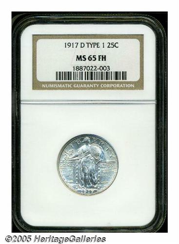 <B>1917-D<25C> Type One MS65 Full Head NGC.</B></I> A brilliant Gem that has blazing cartwheel luster and a sharp strike. Exquisitely preserved, and worthy of bidder interest from the specialist. Population: 164 in 65 Full Head, 79 finer (5/05).