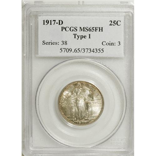 <B>1917-D 25C Type One MS65 Full Head NGC.</B></I> Jay Cline mentions the existence of various size mintmarks for this issue, although we are not aware of many collectors who seek such varieties. This example is highly lustrous with ivory mint frost that is enhanced by speckled gold toning.<BR><BR><b>Shipping:</b> Coins & Currency (<a target="_blank" href="http://www.heritageauctions.com/common/shipping.php">view shipping information</a>)