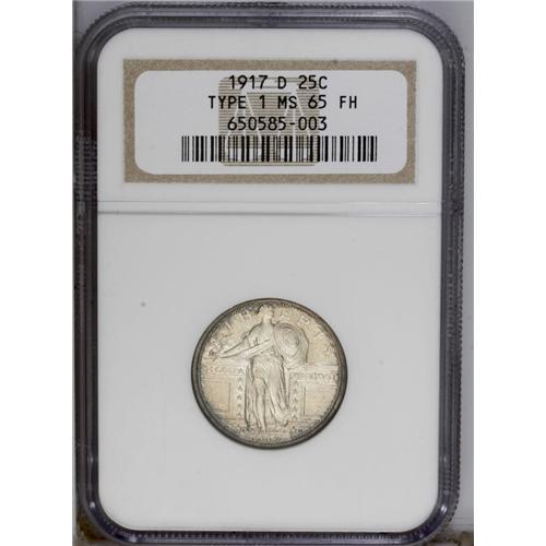 <B>1917-D<25C> Type One MS65 Full Head NGC.</B></I> This Denver Mint Gem provides dynamic cartwheel luster and a pinpoint-sharp strike. The preservation is exemplary, and the borders exhibit attractive russet and aqua toning.