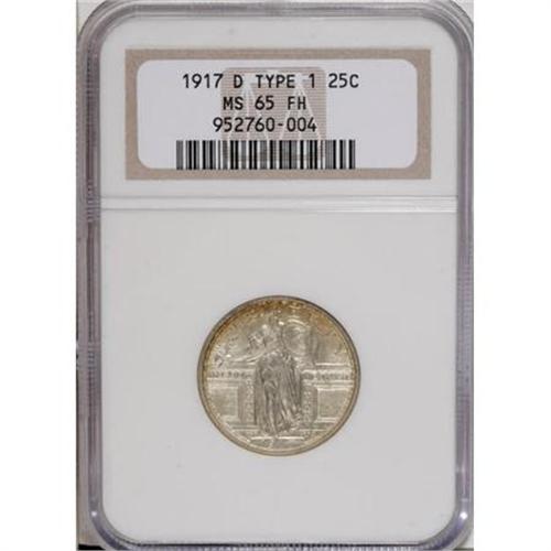 <B>1917-D 25C Type One MS65 Full Head NGC.</B></I> A powerful strike transcends the Full Head to encompass completeness on all of the design elements. Light golden-tan patina gravitates to the borders of this radiantly lustrous Gem, and impeccably preserved surfaces are devoid of mentionable marks.<BR><BR><B>Coin Engraver:</B> Hermon A. MacNeil<BR><BR><b>Shipping:</b> Coins & Currency (<a target="_blank" href="http://www.heritageauctions.com/common/shipping.php">view shipping information</a>)
