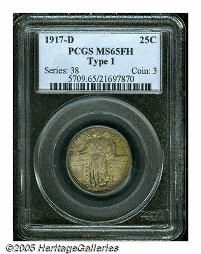 <B>1917-D<25C> Type One MS65 Full Head PCGS.</B></I> A completely original example of this short-lived variety, considered scandalous because of Liberty's exposed breast. Both sides exhibit reddish-russet toning, heavier at the borders. A beautiful Gem.