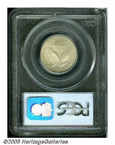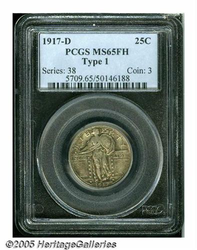 <B>1917-D<25C> Type One MS65 Full Head PCGS.</B></I> Even and medium tones of russet patina have fill the recesses of the obverse design, giving the devices the look of medallic relief, and wisps of sky-blue accent the obverse periphery. The reverse displays a thin veneer of ice-blue and light gray color, overlain by charcoal-gray speckles. Each side is awash in rich luster, and the design elements are well brought up throughout. A couple of miniscule marks on Liberty's chest are mentioned for accuracy. A very attractive all around coin.