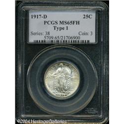 1917-D 25C Type One MS65 Full Head PCGS. Lustrous <B>1917-D 25C Type One MS65 Full Head PCGS.</B></I> Lustrous surfaces are visited by a couple of touches of faint golden-brown toning. Exquisitely struck, with even the inner shield displaying sharp detail. Unobtrusive, minute contact marks are noted on Liberty's neck and right breast, and on the eagle's left wing. A flashy Type One quarter. <BR><BR><B>Important notice:</B> Heritage usually auctions material at the rate of 200-250 lots per hour. On some occasions eBay Live bid software or the Internet may not be able to keep up with the pace of the auction. We recommend placing a realistic absentee bid now as insurance to avoid disappointment. Occasionally the auctioneer may eliminate or reject an eBay Live bid, and the auctioneer may also reopen a lot after the close of the eBay live bidding (usually because we missed an audience bid), and may reject your bid even if it shows you as the winning bidder. By bidding via eBay Live, you agree that Heritage may award the lot to another bidder at its sole discretion under the circumstances described above or any other reasonable circumstances. Since eBay bids are not shown to us until we open the lot on the floor, we treat those bids just like floor bids. In most cases the floor responds before the eBay bid is presented to us, due to Internet lag time, so for consistency we have made it a policy that floor bids are always considered first over tie eBay live bids. Also please note that all Heritage lots purchased through eBay Live carry a 20% Buyer's Premium. Please make sure you read the Terms and Conditions before you bid. This lot is being auctioned in conjunction with a live floor auction by Heritage Galleries & Auctioneers. All final auction and invoice information will be supplied by Heritage Galleries & Auctioneers, and all other information should be considered preliminary. Lot:5936