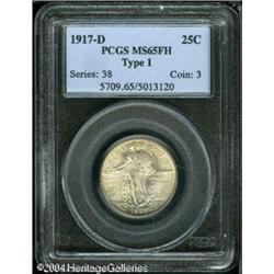 1917-D 25C Type One MS65 Full Head PCGS. Lustrous <B>1917-D 25C Type One MS65 Full Head PCGS.</B></I> Lustrous surfaces reveal touches of light olive color, and boldly impressed design elements. Minor abrasions are seen on Liberty's cheek and neck, and a couple of minute milling marks occur on the chest. <BR><BR><B>Important notice:</B> Heritage usually auctions material at the rate of 200-250 lots per hour. On some occasions eBay Live bid software or the Internet may not be able to keep up with the pace of the auction. We recommend placing a realistic absentee bid now as insurance to avoid disappointment. Occasionally the auctioneer may eliminate or reject an eBay Live bid, and the auctioneer may also reopen a lot after the close of the eBay live bidding (usually because we missed an audience bid), and may reject your bid even if it shows you as the winning bidder. By bidding via eBay Live, you agree that Heritage may award the lot to another bidder at its sole discretion under the circumstances described above or any other reasonable circumstances. Since eBay bids are not shown to us until we open the lot on the floor, we treat those bids just like floor bids. In most cases the floor responds before the eBay bid is presented to us, due to Internet lag time, so for consistency we have made it a policy that floor bids are always considered first over tie eBay live bids. Also please note that all Heritage lots purchased through eBay Live carry a 20% Buyer's Premium. Please make sure you read the Terms and Conditions before you bid. This lot is being auctioned in conjunction with a live floor auction by Heritage Galleries & Auctioneers. All final auction and invoice information will be supplied by Heritage Galleries & Auctioneers, and all other information should be considered preliminary. Lot:5937