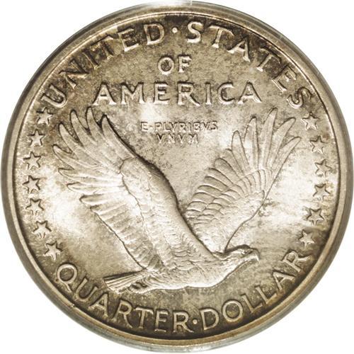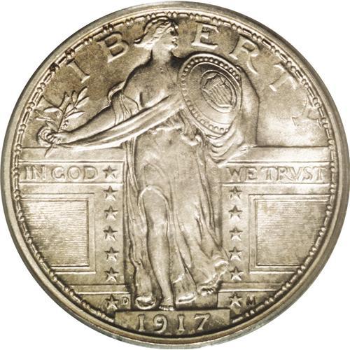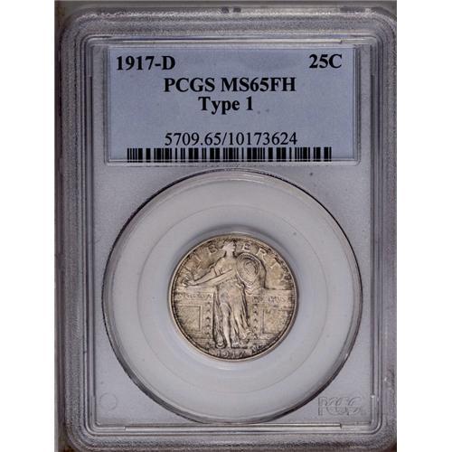 <B>1917-D<25C> Type One MS65 Full Head PCGS.</B></I> Original light golden-gray, ice-blue, and olive toning endows this lustrous and carefully preserved Gem. Only a few shield rivets near the chest lack absolute detail. The 1917-D is noticeably scarcer in better Uncirculated grades than its Philadelphia Mint counterpart.