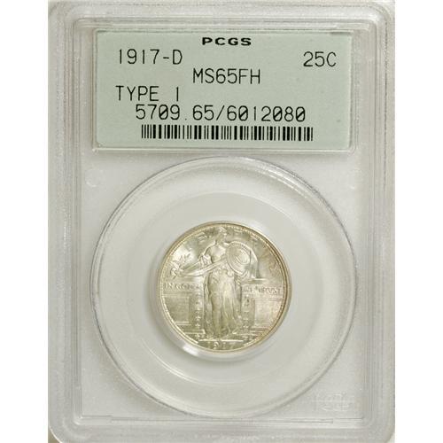 <B>1917-D 25C Type One MS65 Full Head PCGS.</B></I> With just over 1.5 million pieces struck, the 1917-D Type One has the second-lowest mintage for the subseries, trailing only the famous 1916. Ice-blue and pink-violet patina graces the slightly frosty surfaces of this boldly impressed Gem, a coin housed in a green label holder.<BR><BR><b>Shipping:</b> Coins & Currency (<a target="_blank" href="http://www.heritageauctions.com/common/shipping.php">view shipping information</a>)