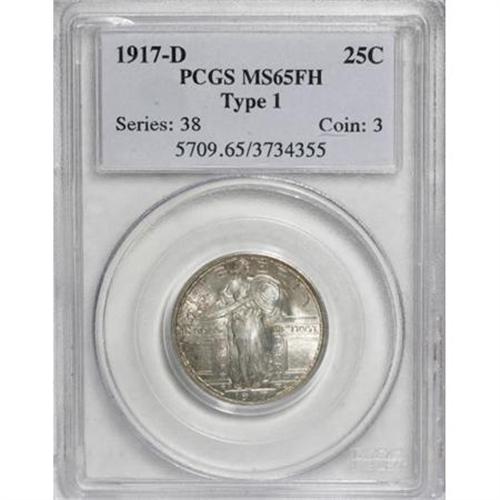 <B>1917-D 25C Type One MS65 Full Head PCGS.</B></I> Freckled walnut-brown and jade-green iridescence endows this lustrous and crisply struck Gem. Neither side displays relevant contact, and the eye appeal is exceptional. <BR><BR><B>Coin Engraver:</B> Hermon A. MacNeil<BR><BR><b>Shipping:</b> Coins & Currency (<a target="_blank" href="http://www.heritageauctions.com/common/shipping.php">view shipping information</a>)