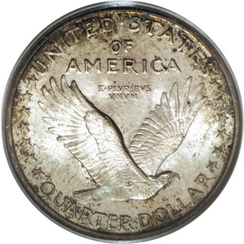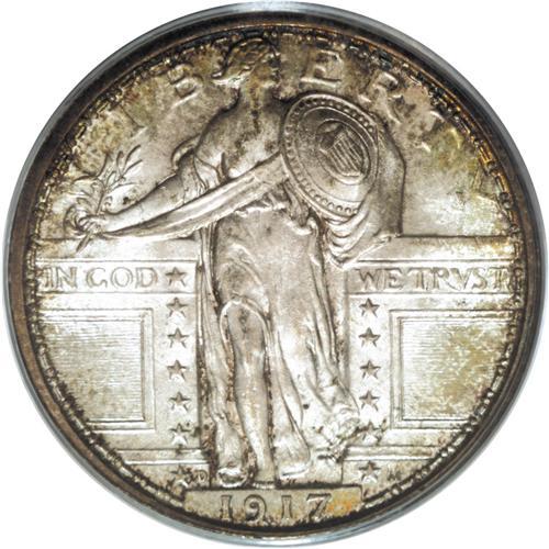 <B>1917-D 25C Type One MS66 Full Head PCGS.</B></I> Lovely peripheral russet and yellow-green patina frames the lighter lilac centers. A touch of weakness on the shield is absent elsewhere, and the head is exquisitely detailed on this highly lustrous and minimally marked coin. The 1917-D Type One is the lowest-mintage of the six 1917 Standing Liberty quarter issues. Certified in a green-label holder.<BR><BR><b>Shipping:</b> Coins & Currency (<a target="_blank" href="http://www.heritageauctions.com/common/shipping.php">view shipping information</a>)