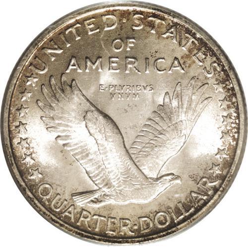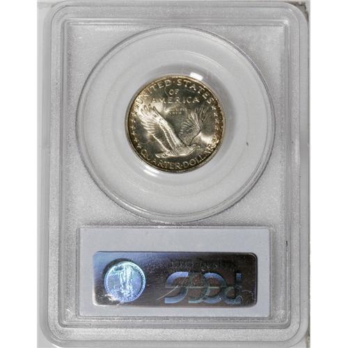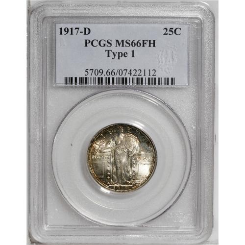 <B>1917-D<25C> Type One MS66 Full Head PCGS.</B></I> While only valued at roughly twice the price of a P-mint Type One, the D-mint is three to five times scarcer, according to Jay Cline in the third edition of <I>Standing Liberty Quarters.</B></I> The mint luster on this piece is nothing less than dazzling. Bright and mostly untoned in the centers, the margins display patchy russet coloration. This is an original 1917-D Type One and a coin that is surely destined for one of the premier sets of Standing Liberty quarters being assembled today.