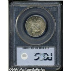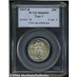 <B>1917-D<25C> Type One MS66 Full Head PCGS.</B></I> A light film of pale aqua, violet, lime-green, and gold uniformly grace lustrous, satiny surfaces. The design elements are exquisitely struck, further enhancing the quality of this highly attractive Standing Liberty quarter. Added to this are the pristine surfaces that reveal no significant abrasions or spots. One trivial small nick on Liberty's right leg above the knee does not in the least detract. Population: 71 in 66, 17 finer (3/04). <BR><BR><B>Important notice:</B> Heritage usually auctions material at the rate of 200-250 lots per hour. On some occasions eBay Live bid software or the Internet may not be able to keep up with the pace of the auction. We recommend placing a realistic absentee bid now as insurance to avoid disappointment. Occasionally the auctioneer may eliminate or reject an eBay Live bid, and the auctioneer may also reopen a lot after the close of the eBay live bidding (usually because we missed an audience bid), and may reject your bid even if it shows you as the winning bidder. By bidding via eBay Live, you agree that Heritage may award the lot to another bidder at its sole discretion under the circumstances described above or any other reasonable circumstances. Since eBay bids are not shown to us until we open the lot on the floor, we treat those bids just like floor bids. In most cases the floor responds before the eBay bid is presented to us, due to Internet lag time, so for consistency we have made it a policy that floor bids are always considered first over tie eBay live bids. Also please note that all Heritage lots purchased through eBay Live carry a 20% Buyer's Premium. Please make sure you read the Terms and Conditions before you bid.
