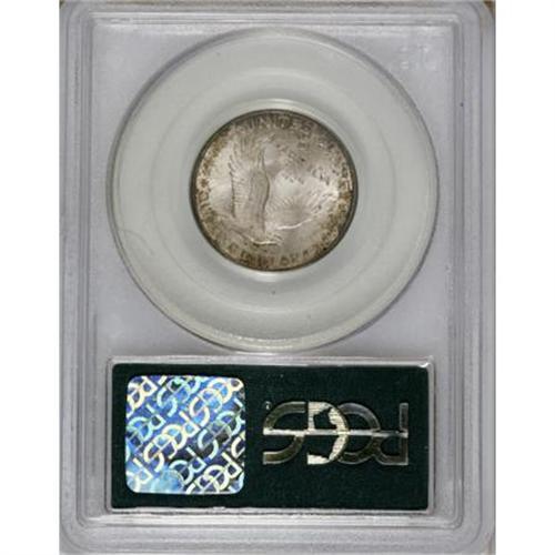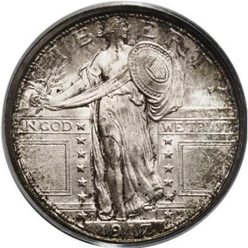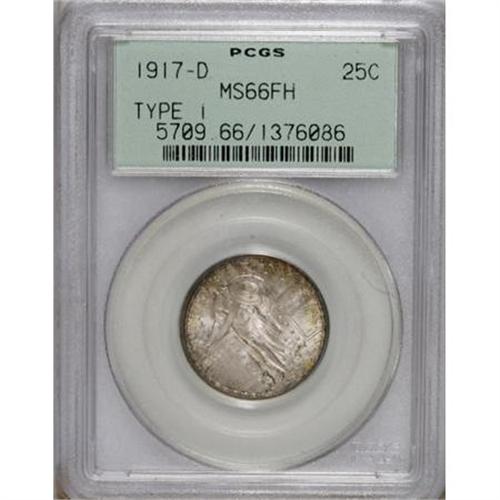 <B>1917-D 25C Type One MS66 Full Head PCGS.</B></I> Lovely peripheral russet, olive, and yellow-green patina frames the lighter silver-gray centers. A touch of weakness on the shield is absent elsewhere, and the head is exquisitely detailed on this highly lustrous and minimally marked coin. The 1917-D Type One has the lowest mintage of the six 1917 Standing Liberty quarter issues. Certified in a green label holder. Population: 98 in 66, 17 finer (6/07).<BR><BR><B>Coin Engraver:</B> Hermon A. MacNeil<BR><BR><b>Shipping:</b> Coins & Currency (<a target="_blank" href="http://www.heritageauctions.com/common/shipping.php">view shipping information</a>)